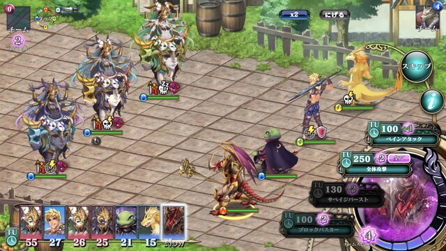 バトルは単純なターン制ではなく、「TU(タイムユニット)」という行動順や、「スピリット」というスキル発動に必要なコストを管理しながら戦う、非常に戦略的なシステムになっています。