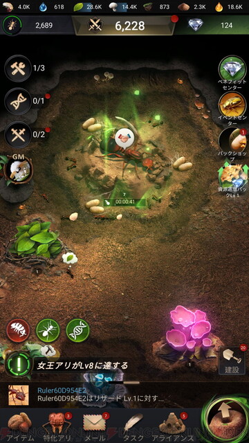 資源を生み出す「アブラムシ」や「菌類」、兵隊アリを治療する「治療池」など、目的に応じた施設を建設し、レベルを上げて巣の機能を強化していきましょう。