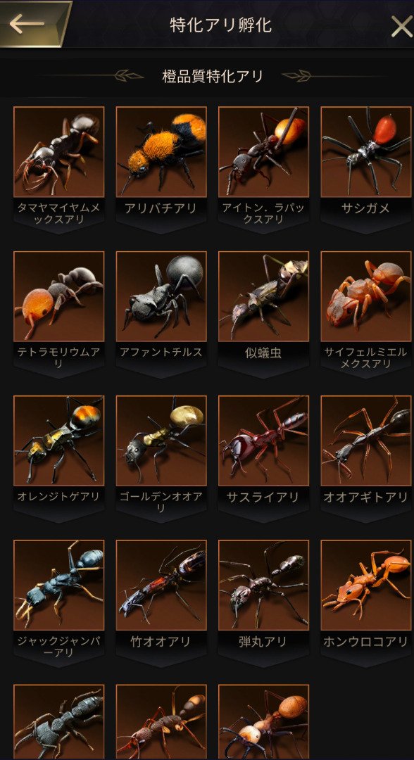 特化蟻は主にガチャ(特化蟻孵化)で入手し、レベルアップやスキル強化で育成していきます。どの特化蟻を育てるかで、あなたのアリ塚の方向性が決まると言っても過言ではありません!
